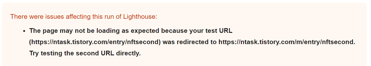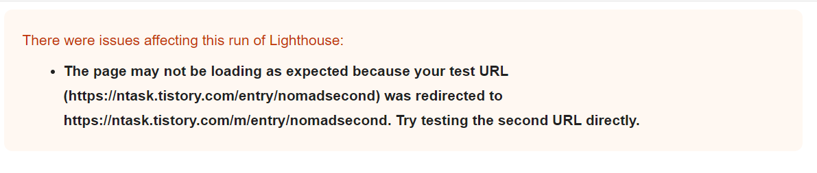 실시간 테스트에서는 아무 문제가 없는 것으로 뜨는데 (초록색 체크들) Google색인 (빨간 느낌표들)에서는 리디렉션 에러가 있다고 뜨는군요. 애러가 난 두 개의 페이지 모두 같은 현상을 보이고 있습니다. 리디랙션이 어디로 되는지라도 알려주면 어떻게 해보겠는데 그런 이야기도 없이 뜬금없는 리디랙션 에러를 내고 있습니다. 이전에 겪었던 리디렉션애러와 같은경우입니다.. 입속에서 육두문자들이 춤을 춥니다.. 불행중 다행인건 ntask.tistory.com 전체가 아니라 두개의 페이지에서만 리디랙션 에러가 뜨고 있단 점입니다. 최악의 경우, 두 페이지를 그냥 지워버리는 수가 살아 있습니다. 그래도 뭐라도 해보려고 해당 블로그페이지에 들어가서 Lighthouse를 실행시킵니다. Lighthouse 는 일전에 SEO를 확인하기 위해 사용했던 홈페이지 디버깅툴? 정도로 생각하시면 되는 크롬 익스텐션입니다.