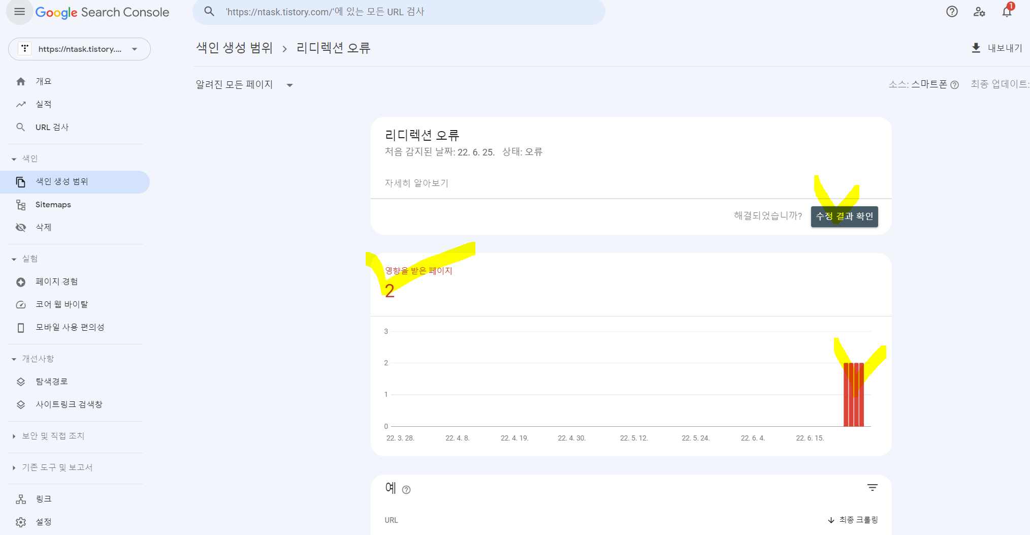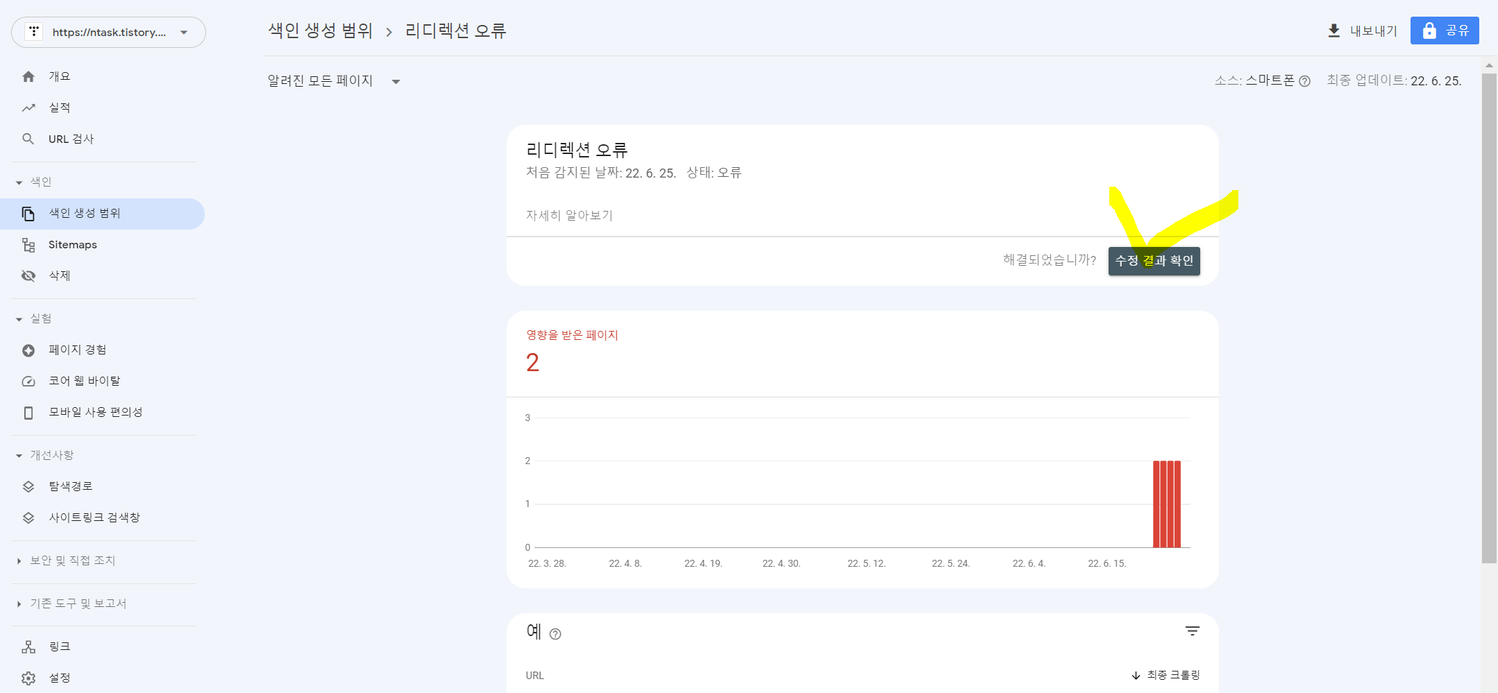 페이지 색인 생성 문제 해결하기를 클릭합니다.