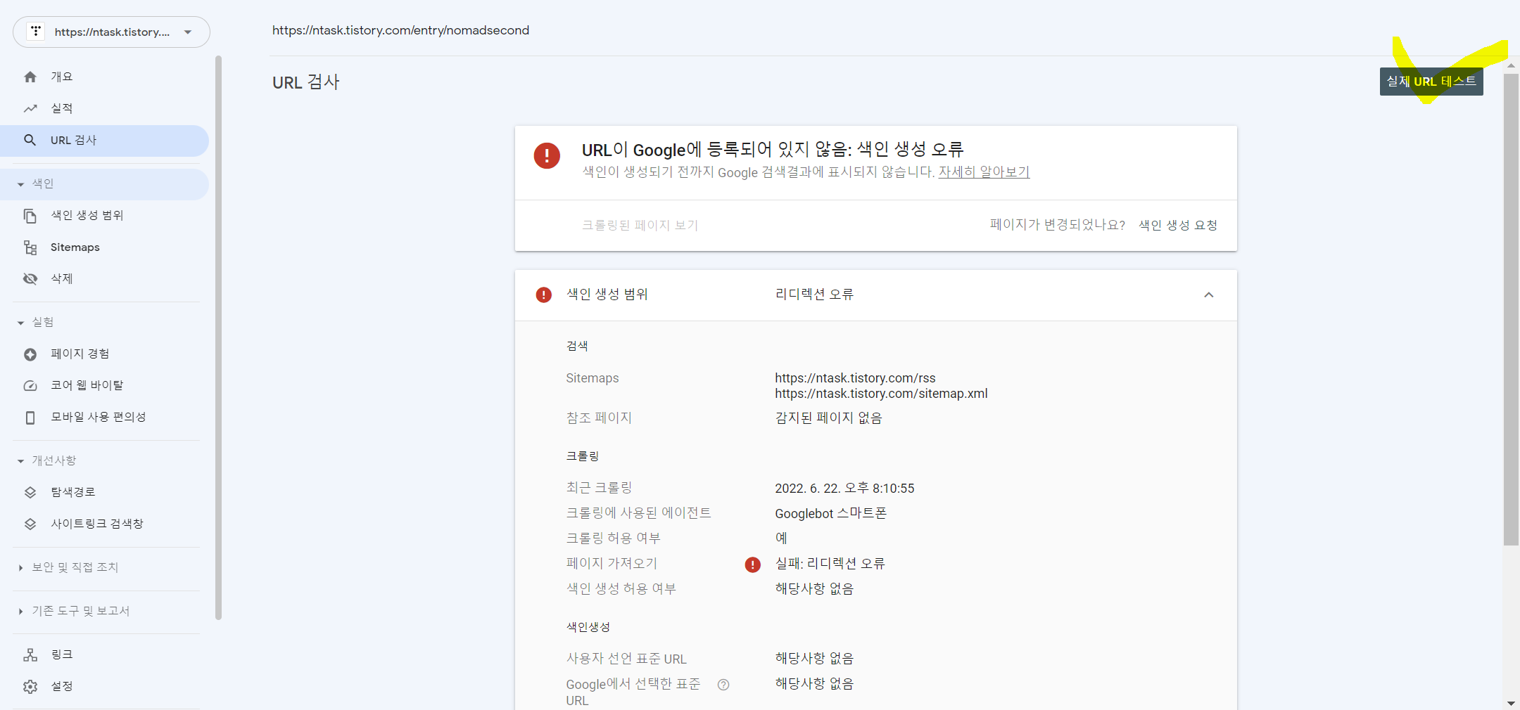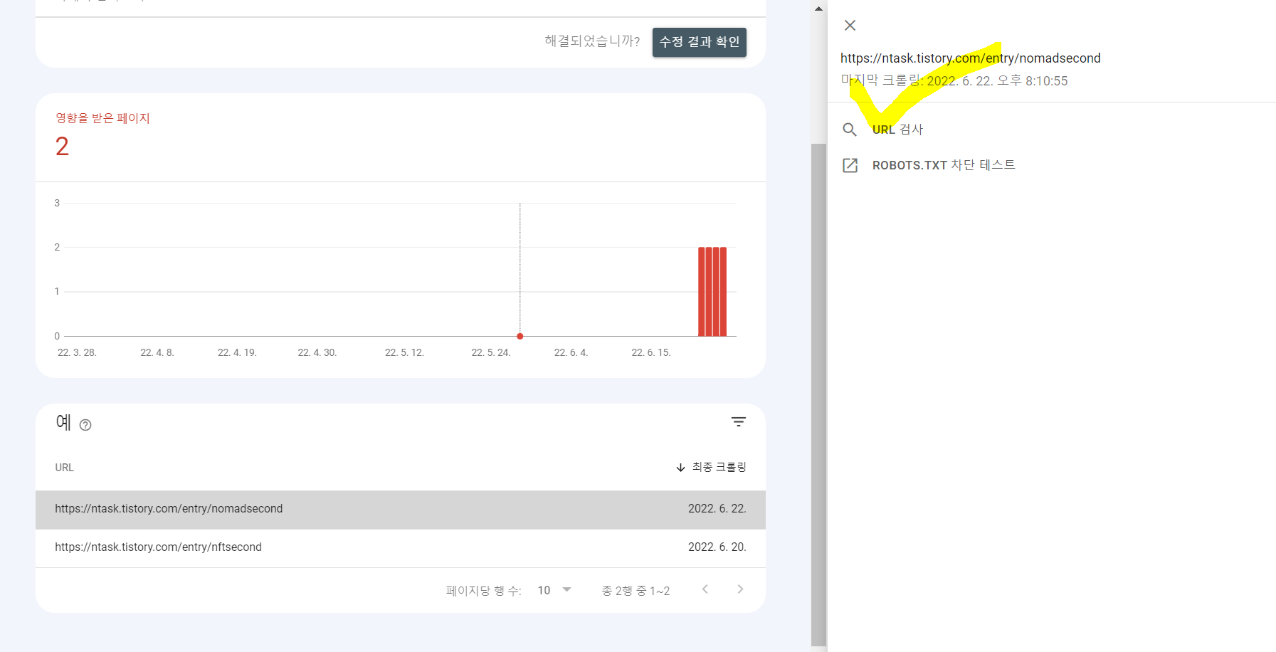 우측에 URL 검사가 뜨네요 클릭해봅니다.
