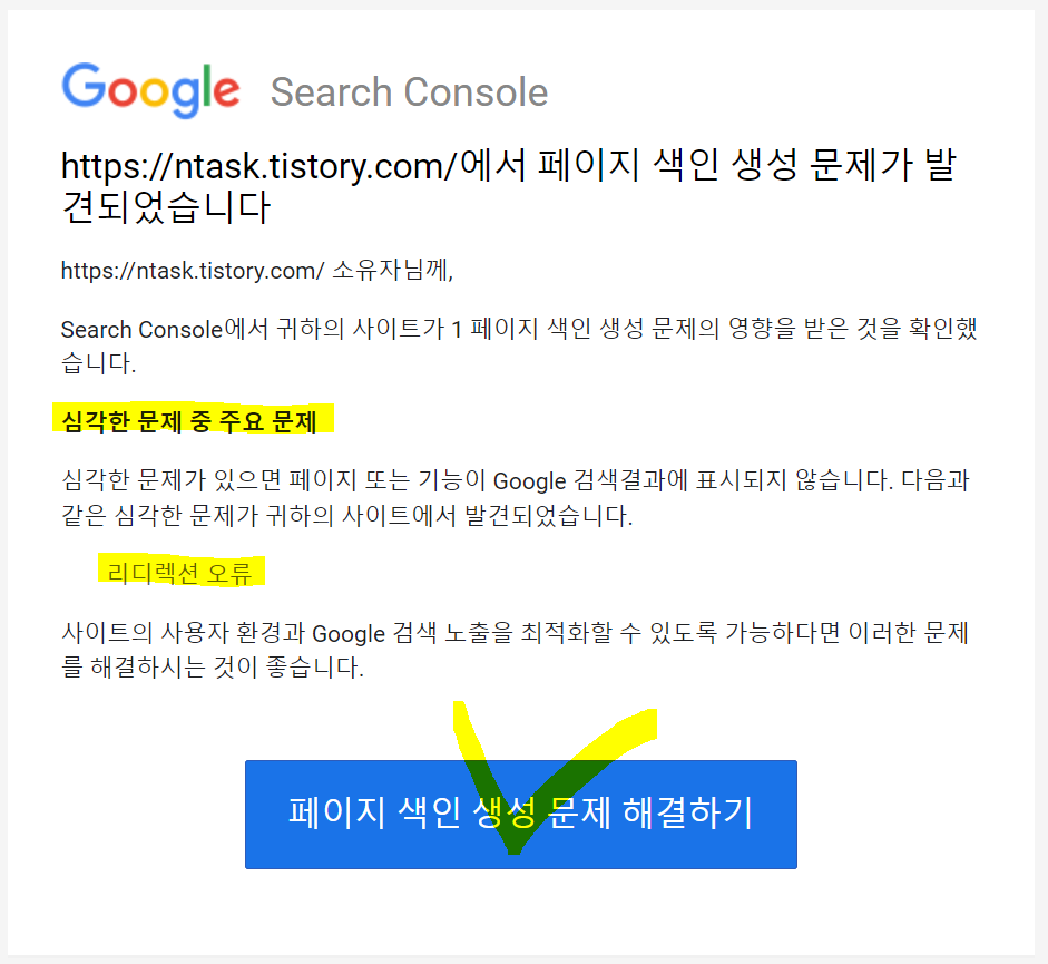 초짜배기입니다. 오늘은 또 구글에서 아래와 같은 메세지를 받았습니다. 요즘엔 구글서 메일 올때마다 가슴이 쿵쾅쿵쾅 뛰네요~ 이번엔 또 뭐가 문제일까요? 메일에 써있기로는 "심각한 문제중 주요문제"라며 "리디랙션 오류"라고 써 있습니다. 리디랙션 오류와는 한차례 안좋은 기억이 있기에 한바탕 시원하게 육두문자를 입속에서 되네어 줍니다. 그리고 문제 해결을 위해 작업을 시작해봅니다.