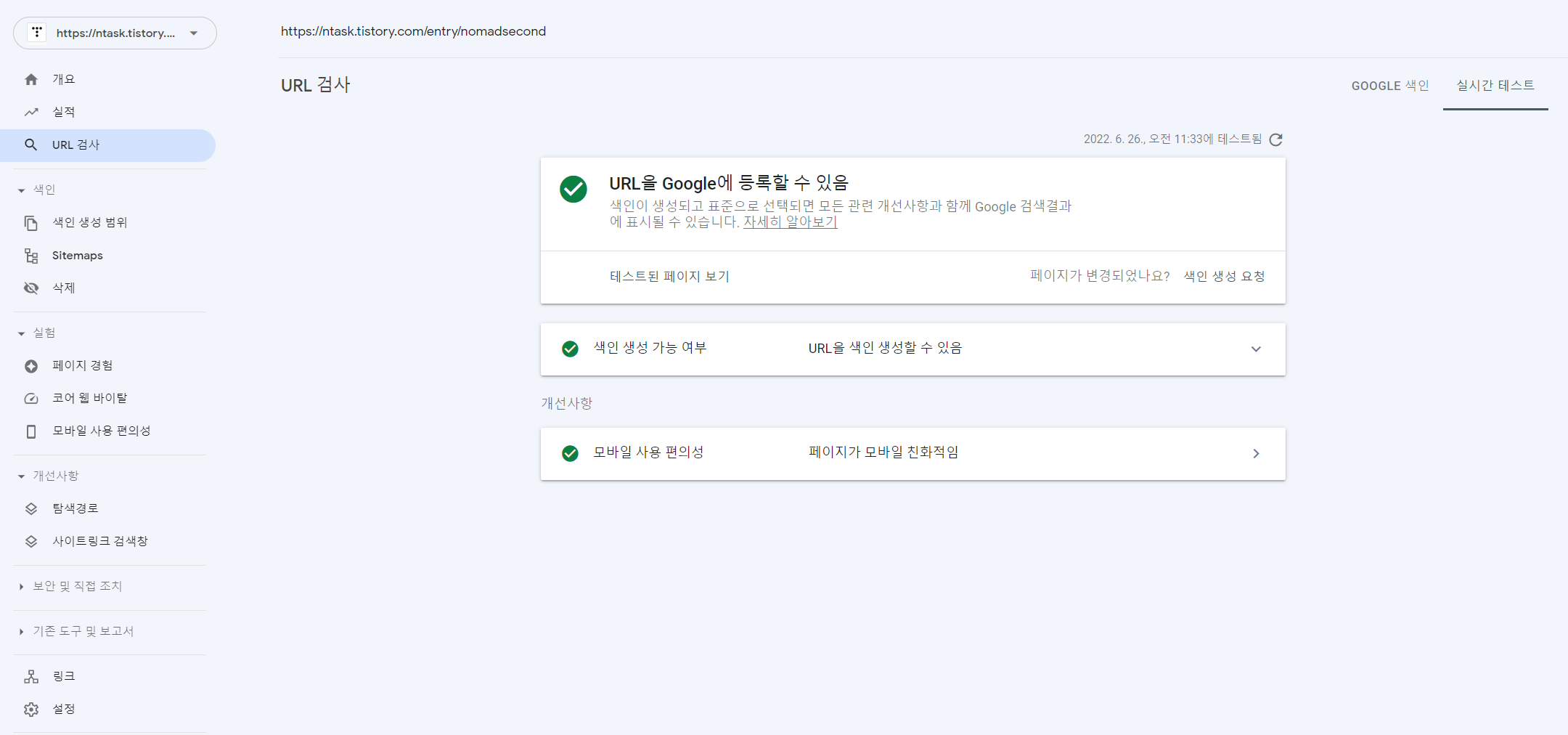 다시 한번 더 실제 URL 테스트를 눌러줍니다.