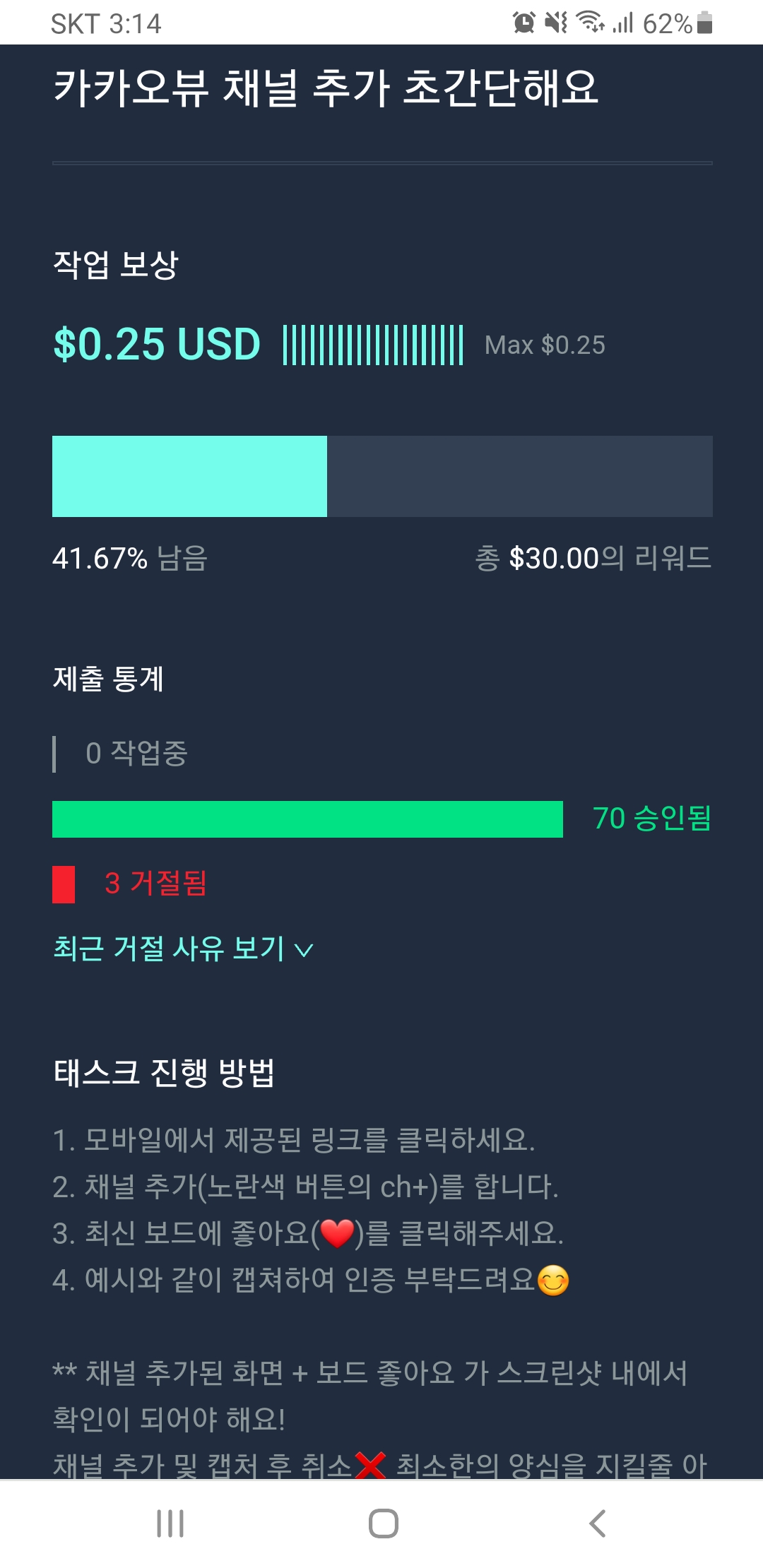 제목에 카카오뷰 채널 추가라고 써있고 이미 70명이 승인된 태스크다.