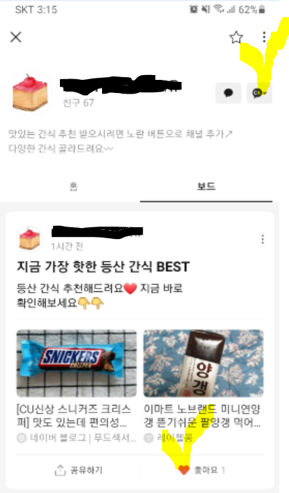 예상대로, 친구 추가, 보드 라이크, 그리고 그게 인증되게끔 스크린샷 한장 이면 되는 태스크. 아쉬운건 정보가 없어 제공된 링크를 클릭하는 것 외에 내가 직접 카뷰에 들어가서 찾아서 추가하는 방법은 없는 상황이다. 어쩔 수 없지 뭐.. 주어진 링크를 클릭한다. 친구 추가를 누르니 카톡상에서 진행해야 하는 작업이라며 카톡을 열어준다. 열린 카톡상의 화면은 친추를 하고 좋아하기를 눌러야할 보드가 펼쳐져있는 상태. 바로 친추, 좋아요를 누른 후 스샷을 남긴다.